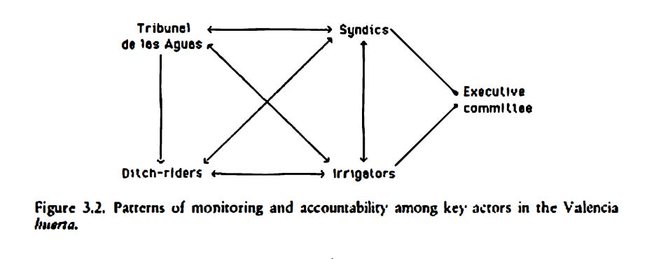 Consider Ostrom’s treatment of the Spanish Huerta system, and the governing role played by the farmers themselves: